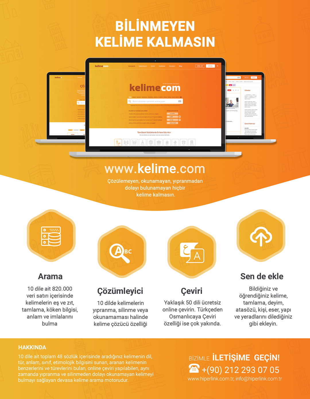 Kelime.com: Onlarca sözlük içerisinde aradığınız kelimenin dil, tür, anlam ve etimolojik köken bilgisini sunan, aranan kelimenin benzerlerini ve türevlerini bulan, aynı zamanda yıpranma ve silinmeden dolayı okunamayan kelimeleri çözümlemeye yarayan bir sözlükler veritabanıdır.